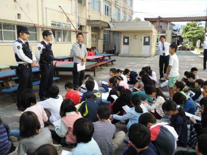 最後に、中庭で、北警察署の方から「警察の仕事」について、くわしくお話を聞きました。子どもたちからのたくさんの質問にも、丁寧に答えていただきました。