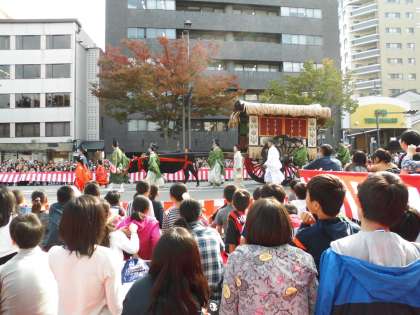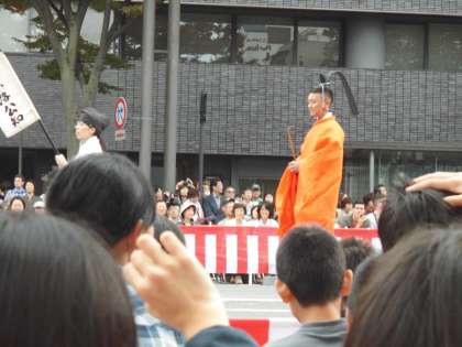 22日(木)に6年生が京都三大祭のひとつ『時代祭』の見学に行ってきました。市役所前に用意していただいた“特等席”で,馬上の武将やかごに乗る女官等,その時代を象徴するような装束を身にまとった行列が,次々に目の前を通っていきました。手を振ったり歓声をあげたり・・・うん?行列の中によく知っている人が・・・。
