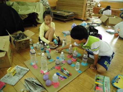 どんぐりや、空き缶、ペットボトル、わりばしなどを使って、どんな遊びができるかを工夫しています。