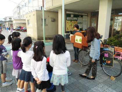 中間休みに「のほほんクラブ」の方による、自転車紙芝居がありました。子どもたちは、「お話の世界」に浸っているようでした。