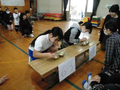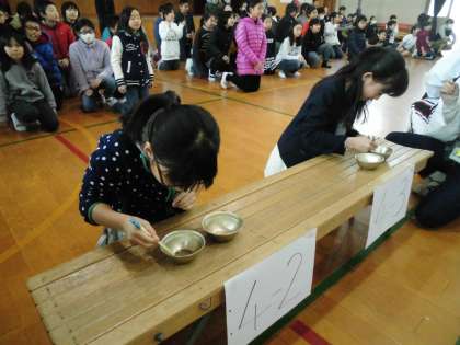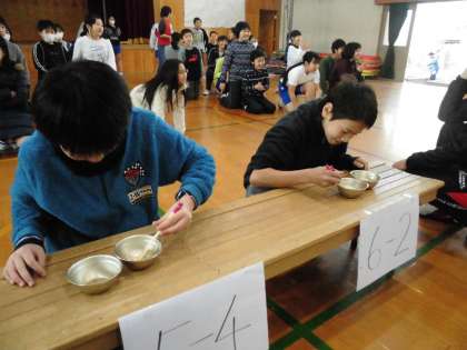 各クラス10人の代表が,順番に正しいおはしの使い方で,食器に入った5個の大豆をとなりの食器にうつし,うつし終えたら次の人と交代し,リレーしながら10人終わるまでの速さを競いました。