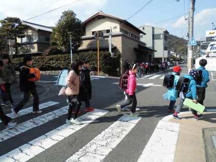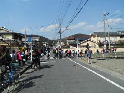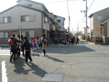 その後,各町ごとに新班長さんを先頭に,並んで集団下校しました。広がって歩かないことや路側帯の内側を歩くことなど安全確認をしながら,地域委員さん・町別担当者と共に下校しました。