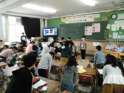まずは,2年生の教室に入って,「ランドセルをせおってみよう」の体験学習です。その前に,小学校で毎朝行っている「朝の会」を一緒にやってみました。