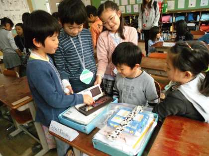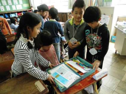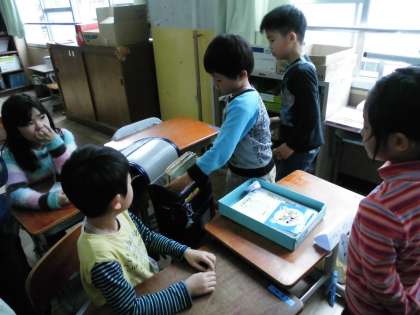 お道具箱の中に入っている物の説明を聞いたり,ランドセルの中に教科書などを入れたりしました。