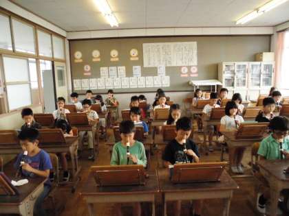 次に,姿勢をよくしてリコーダーの演奏に挑戦です。息の出し方,タンギング,指の押さえ方…まだまだ難しそうです。
