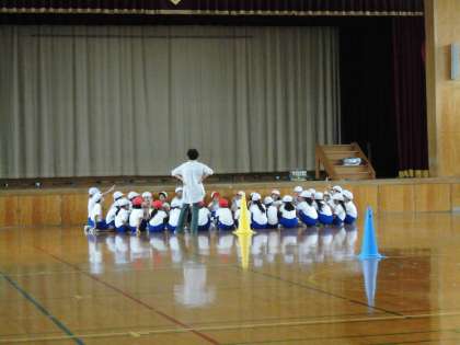 3年生は,各色で集まって,棒引きの作戦をたてています。