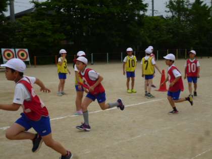 体育ではリレーをしています。競争をすることも大切ですが,バトンパスの工夫をし,「チームの記録を縮める」ことを一番に活動しています。