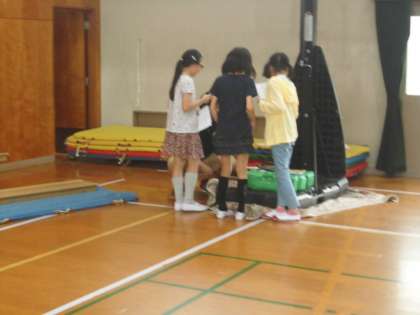 準備の様子です。司会の計画委員は打合せ中。外では,6年生が1年生を連れて待っています。少し緊張しているかな。
