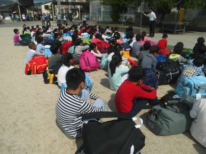大きな荷物を抱えて,みんなでバスに乗り込みました。