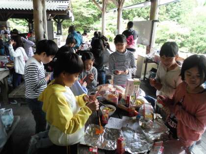 今日の朝食は「パックドック」です。少しパンが焦げてしまった人もいましたが,とてもおいしく食べることができました。