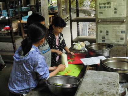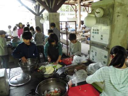 朝食を食べた後 しばらくするともう昼食づくりです。今日の昼食は「豚汁」です。野外炊事で作るのはこれが最後です。失敗しないよう 協力して作りました。