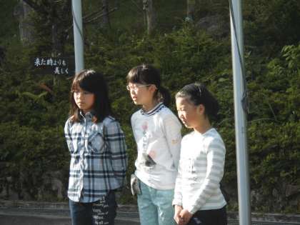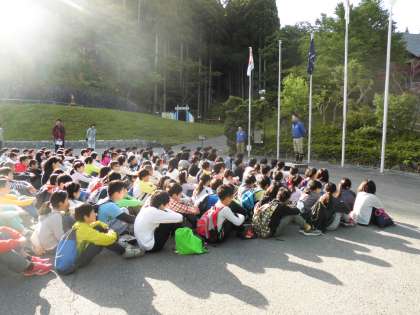 今日の朝の集いは,4校合同の朝の会でした。各校の代表が学校紹介をします。上賀茂校の学校紹介では,学校の正門の事や賀茂なす・すぐきの上賀茂の伝統野菜,お祭りや神社の事を発表しました。しっかりとした声で発表できました。
