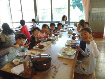 登山の疲れ&汚れ?をお風呂で落とし,美味しい夕食をガッツリいただきました。お風呂も食事も,みんなと一緒で楽しいです!