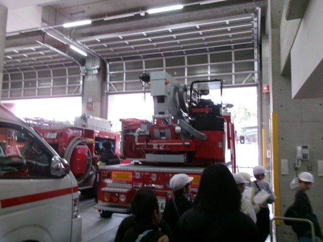 社会科の学習で北消防署へ行きました。普段は見ることができない、署内で消防士さんが過ごされている場所や指令が届くところなども見せていただき、とても勉強になりました。消防士さんは24時間勤務なので、いつ出動の連絡が入るか分からないため、ごはんを食べる時も休憩の時も気を抜けずにお仕事をされていました。