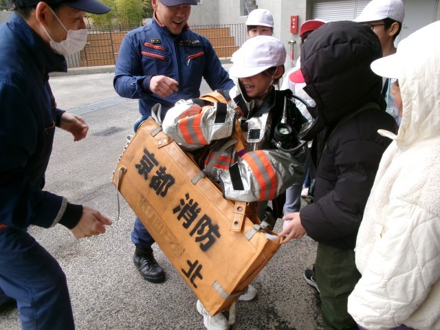 また、消防車両についても詳しく見せていただいたり、実際に消火活動へ向かうときは10キロ以上の重量のものを身につけられることも教えていただいりしました。実際にもった子は「動けない~!」と驚いていました。日々の訓練など大変な思いをしながら、私たちの生活を守るため日々活動しておられる消防士のみなさんの話を聞くことができ、子どもたちも大きな学びを得て帰ってきました。