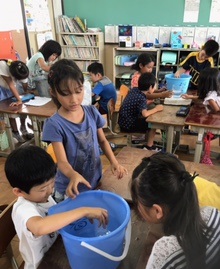 かさの学習で1Lますや1dLますをつかってバケツのかさや身の回りのもののかさを調べました。