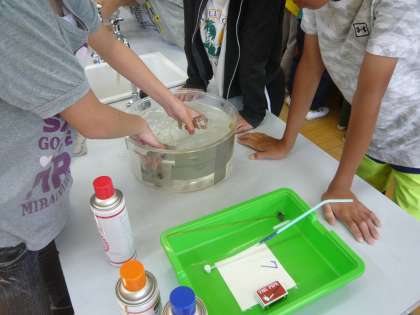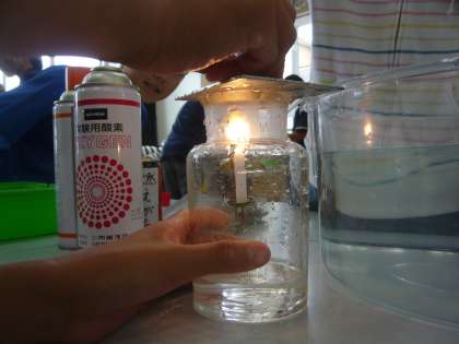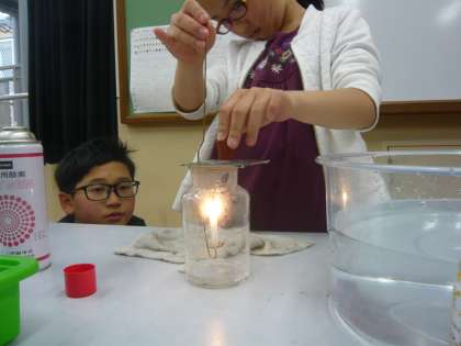 グループの友達と協力して,水中で気体を集め,気体の中でろうそくの火が燃えるか調べました。激しく燃える気体のときは,とても嬉しそうに観察をしていました。
