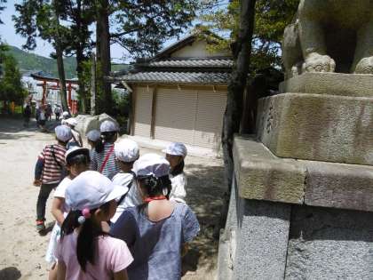 どんどん歩いて,校区内にある貴船神社で休憩しました。道沿いにある大きな鳥居から中に入っていきました。中は日陰になっていて気持ちのよい風が吹いていました。はじめて神社の中に入る子どもたちもたくさんいたようです。少し中の様子も探検しました。