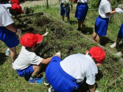 生活科『おおきくなあれ わたしのはな』の学習で,一人ずつアサガオを育てています。ほかにも学校園でいくつかの花を学年みんなで育てる予定です。種まきの前に,必要なのは花壇の準備。いざ花壇に行ってみると…草がぼうぼう。気合いを入れて,みんなで草抜きをしました。