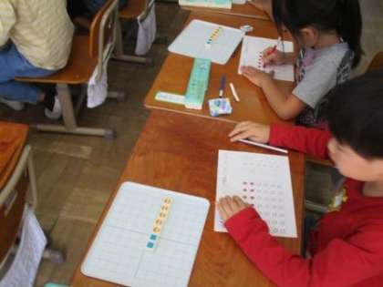 はじめにブロックを並べて考えた後,図に色をぬっていくつといくつにわけられるか整理しました。そして,最後に数字で表しました。