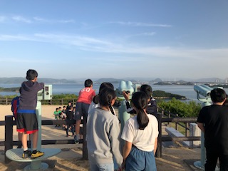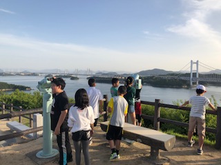 大原美術館,美観地区での見学を終え,鷲羽山展望台で記念撮影ができました。夕日に架かる瀬戸大橋が美しかったです!