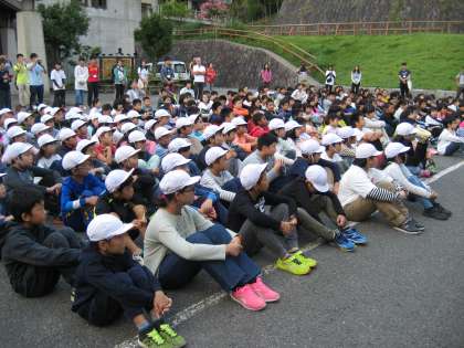 朝の集いで,ともに宿泊した学校の学校紹介を聞きました。