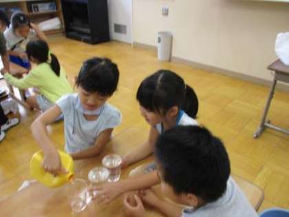 片方にうつしかえたり,それぞれを同じ大きさのコップにうつして高さをくらべたりしました。