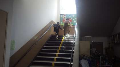 入学してきた一年生の手を優しくひいて,階段を上る6年生。