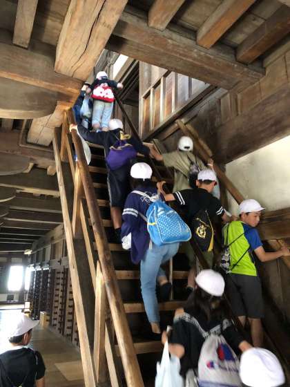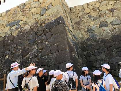 自然の形のまま積まれている部分もあり,機械のない時代にどんな方法で積まれていったのだろうと子どもたちは不思議なまなざしで見ていました。石垣の色は,長年の変化だそうです。
