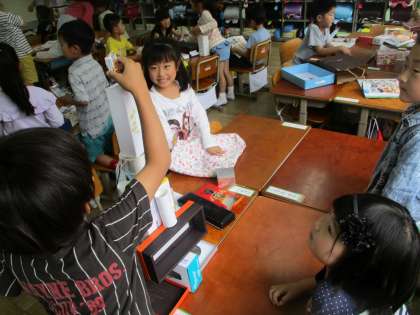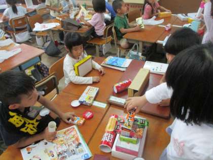 「いろいろなかたち」の学習では,持ってきた様々な箱を使って,いろいろなものを作りました。「京都タワー」や「船」などに見立てて箱を積み重ね,それぞれのグループが箱の特徴を生かし,話し合いながら作っている様子が見られました。