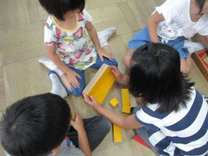 友達と力を合わせて,様々な形の積み木を積む活動を行いました。「転がる形」や「積むことができる形」などその特徴を考えて,積み上げていました。