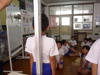 身体計測をする前に養護教諭から『骨の働き』についてのお話を聞きました。骨には「大切な部分を守る」,「体をささえる」,「血液をつくる」,「カルシウム銀行」の4つの働きがあることがわかりました。