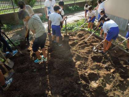 今日の園芸委員会は,春の花を咲かせるために土づくりをしました。