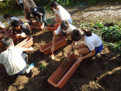 1人ずつプランターに球根を植えることになったので,