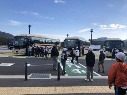 最初の休憩です。バスレクでじゃんけんやクイズをしながら、北淡町に向かいます。