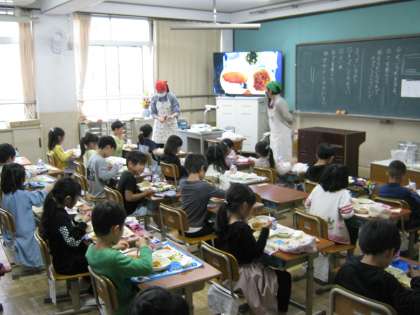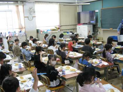 今日は,1年生にとって初めての給食,そして,1年生の入学をお祝いする献立でした。1年生の子どもたちは「おいしい!」「うれしい!」と言いながら食べていました。また,しっかりと黙食ができていました。給食の時間,すてきな1年生の様子が見られました。