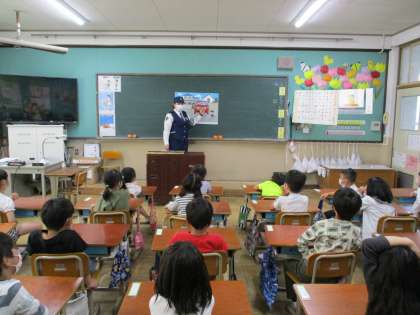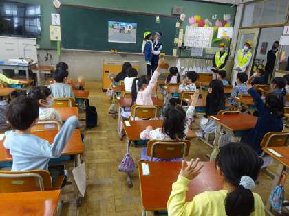 今日は,北警察署の方に来ていただいて,安全な道路の歩き方や横断歩道の渡り方について教えてもらいました。