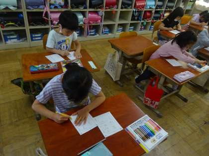名前を丁寧に書いた後は,クーピーで色塗りもしました。