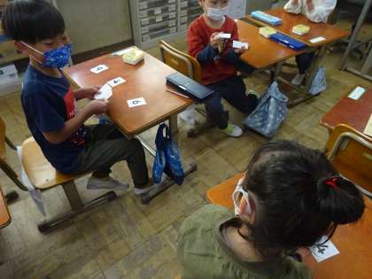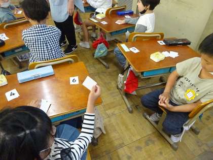 「いっせいので」で出したカードを友だちと比べて,大きいのか小さいのか,同じなのかを伝え合います。