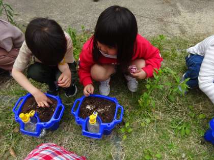 植木鉢に土を入れて,フカフカの土に指で穴をあけました。