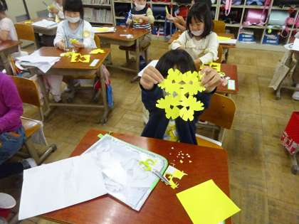 そのあとは,上手に鋏を使いながら色紙を折って切りました。