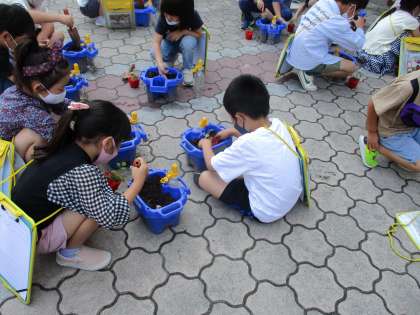 トマトの苗を植えました。観察すると,「触ったら,ザラザラしているよ」