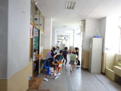 今日は,暴風警報が出たときの避難訓練をしました。