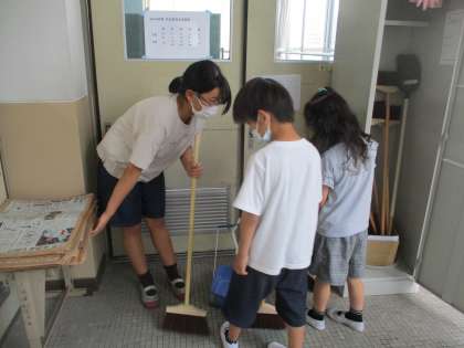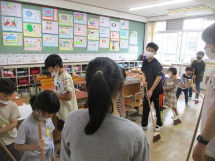 これまで,6年生がお手伝いしてきた1年生の教室掃除。今週からは,1年生も一緒に掃除をしています。1年生に優しく丁寧に掃除の仕方を教える6年生。「そういえば,私たちも1年生の時,掃除の手伝いしてもらっていたな。」と言いながら,一生懸命に掃除をしていました。