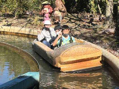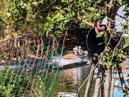 100匹のたぬきが見る中、徳島の自然風景を感じながら、小舟に乗って、川をくだりました。笑顔がいっぱいです。