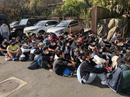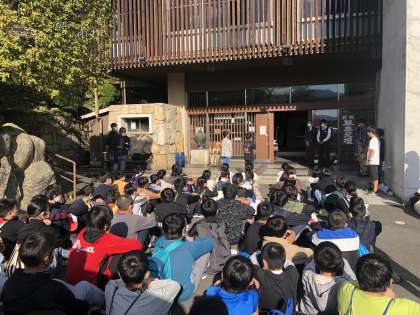 さあ、朝食食べてパワー全開。退館式も終わりました。いよいよ、金毘羅宮へ