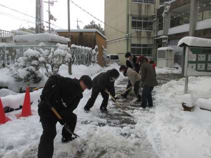 10:45からの登校に向けて、教職員みんなで雪かきをしました。