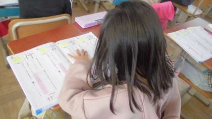 新出漢字を学習しました。子ども達は「ぐー・ぺた・ぴん・さっ!」を合言葉に、姿勢を正して書いていました。ドリルに書き込みが終わった後は、自分で考えて「空書き」をしたり、習った漢字が使われている言葉を考えたりしている姿がみられました。
