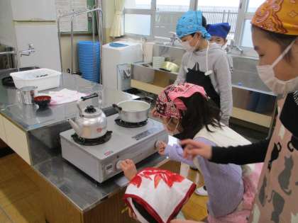 ガスコンロの使い方を学んだ後、全員が点火する体験をしました。急須や湯呑茶碗を使ってお茶を入れたことがない子どもも多く、貴重な体験になったと振り返っていました。