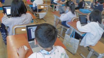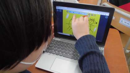 学級活動の時間にGIGA端末を使いました。「ロイロノート」というアプリを使用し、写真や動画を撮って担任に送ったり、自分の名前を書いてみたりしました。約束事を確認したあとは、いざ実践!いつも使っている紙のノートとは違い、間違えてもすぐ消してやり直せることに、子どもたちは「便利〜!」と大盛り上がり。